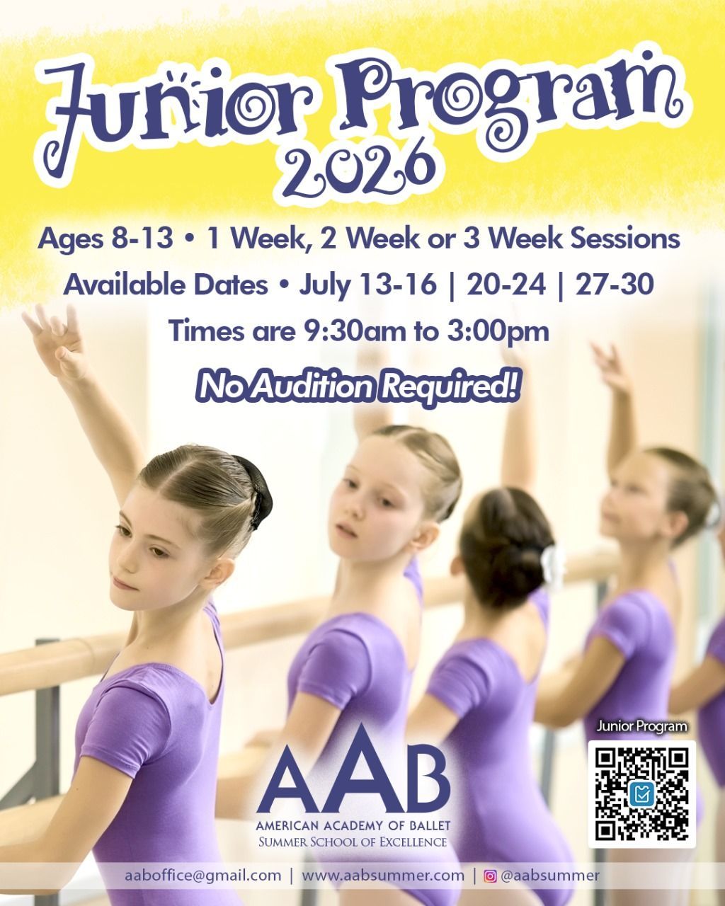 This summer, give your young dancer the opportunity to train, grow, and shine at the AAB Junior Summer Program, a premier ballet experience designed for students ages 8-13 !