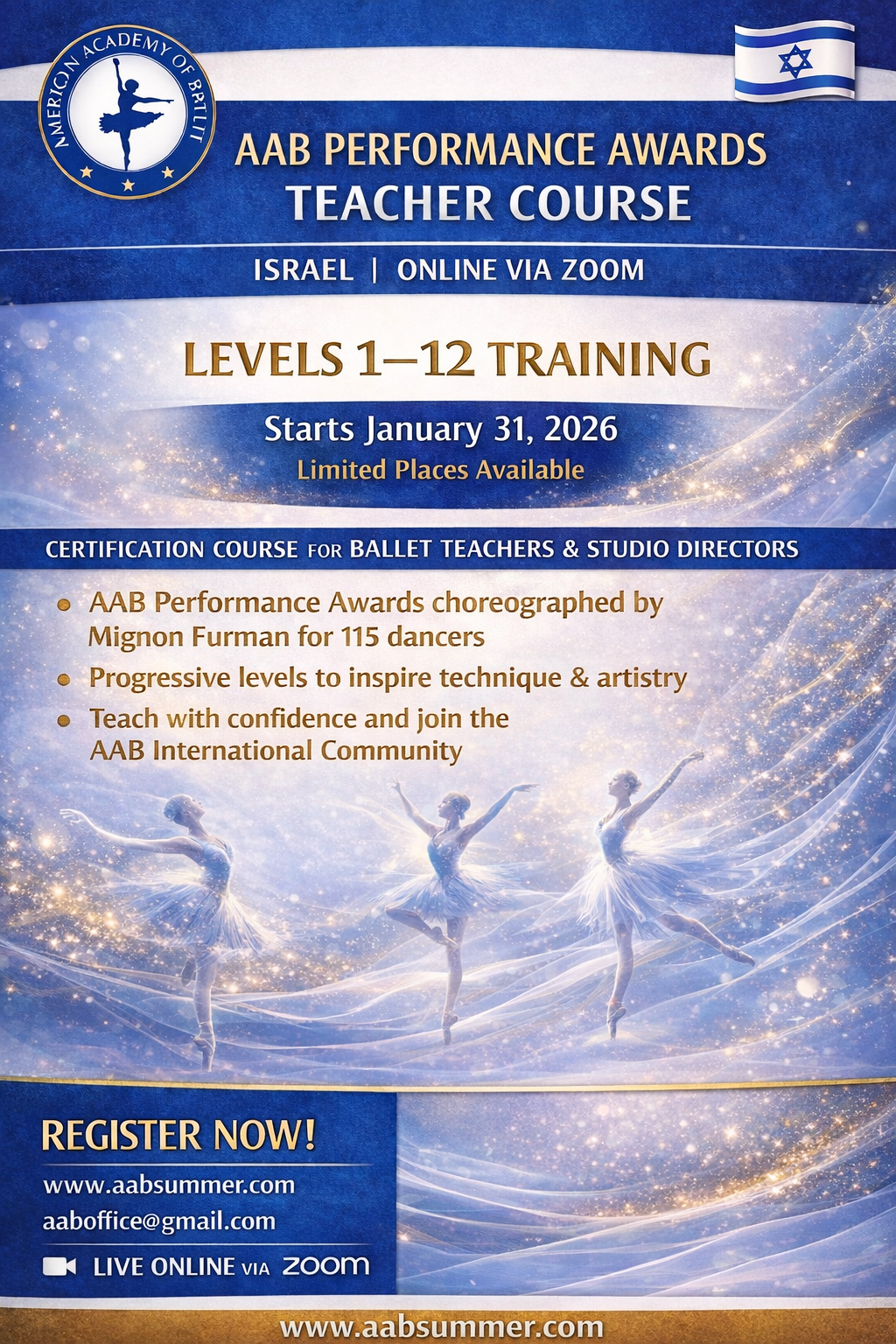 Step into a clear, inspiring teaching pathway with the AAB Performance Awards — Levels 1–12, created by Mignon Furman, founder of the American Academy of Ballet (AAB). This course gives you the structure, guidance, and confidence to bring a full progressive performance-based syllabus into your school—building stronger technique, artistry, and motivation in every class.